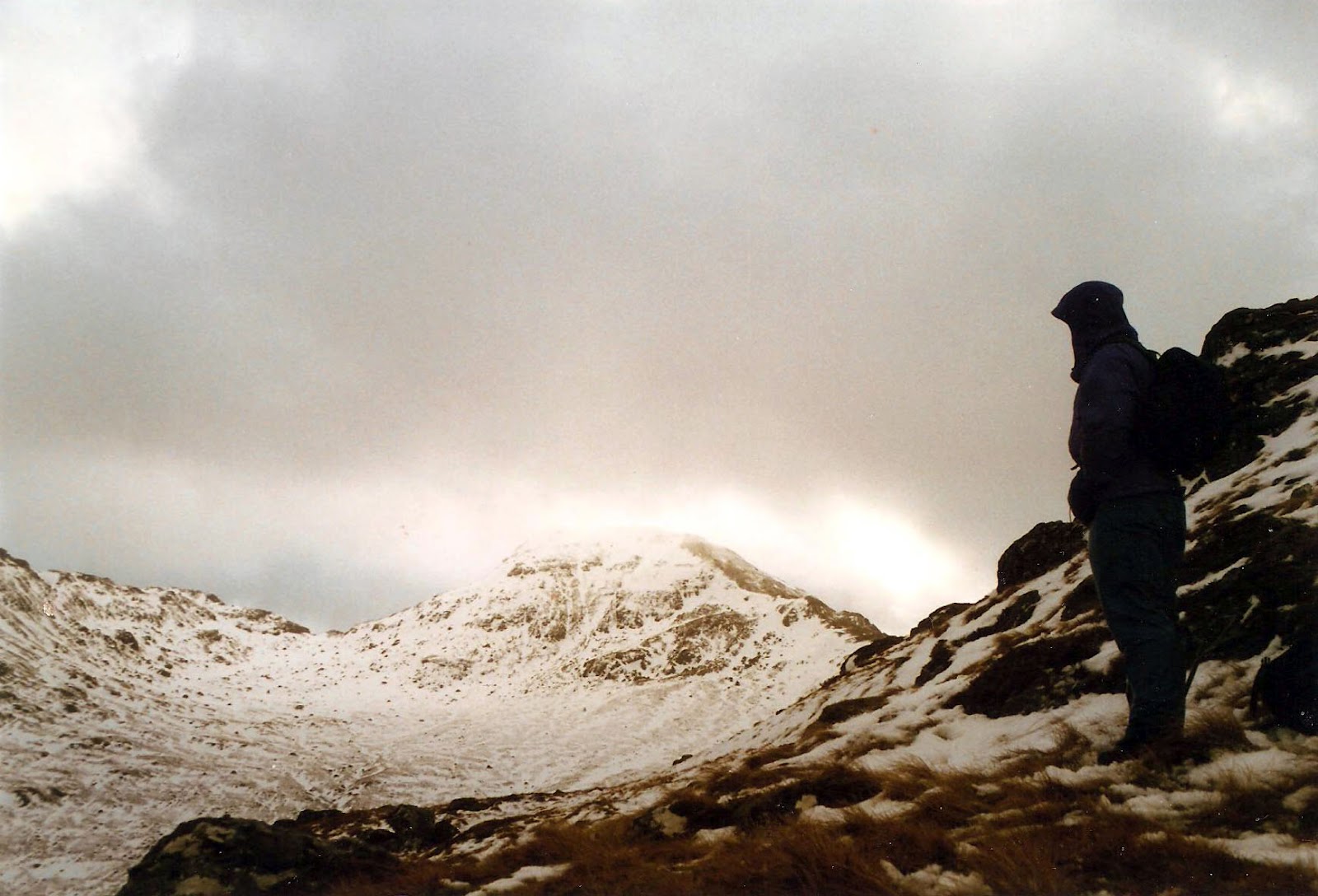 No pictures at the top as we were hit by a blizzard. My home made ice axe was very limited use. Eddie had nothing and almost slipped off the top at one point. We got lost in the storm and came down the wrong valley, found a farm house and hoped there would be some way to get a lift. No luck, so we had to walk a long way back through the Glen in the dark to be met be local police at the car and we were duly chastised.